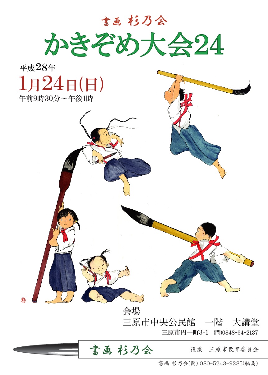ひとまず今週末土曜日は福岡の六本松教室です。今月は第二週目の土曜日ですね。 教室の場所など詳細はコチラ→http://bokudou.biroudo.jp 今月末24日には、当会きっての大行事、なんと24回目のかきぞめ大会が控えています。 体調管理しながら今年も、誠意を忘れず、邁進して行こうと思っています。 書画 杉乃会、今年も何とぞ宜しくお願い致します。 鵜島朴同 拝 |