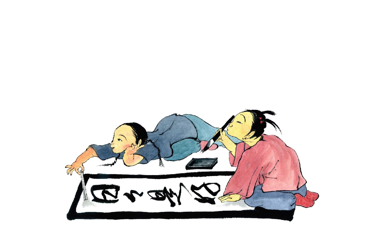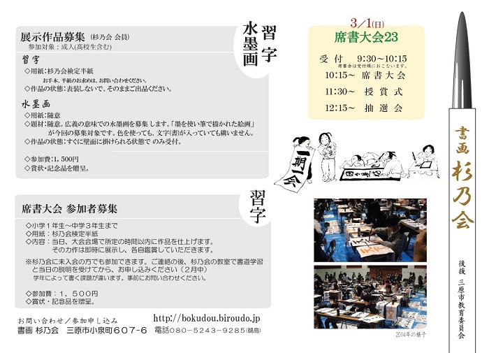 今年は3月1日(日)におこないます♪ 近づいて参りました。 席書大会23の広告を掲載しています。 今年のチラシは書道に打ち込んでいる女の子たちを描きました。 それぞれにモデルがおります。 いつも教室でふれあっている子ども達です。当日も、こんなふうに「楽しんで」、そして「まっすぐ」に書に取り組んでほしいと思います! 朴同 |