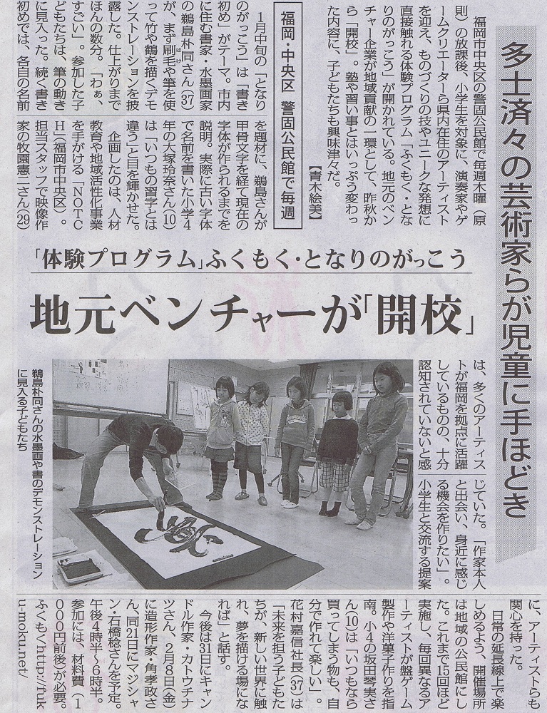 鵜島です。 先日の警固公民館での記事が、今朝(1/31)の毎日新聞さんに掲載されていたそうで、 画像を送ってもらいました~(*´▽`*)
