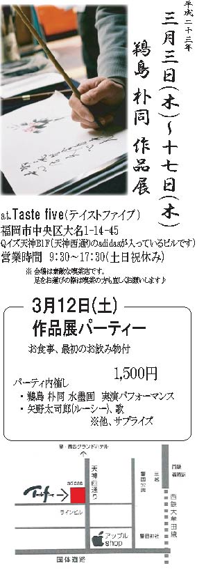 睡魔とのたたかいです 春だからでしょうか… 週末より、いろいろありました! 土曜日は月始めの土曜だったので、早朝から車を飛ばして広島へ。 14時からの水墨画教室をいつも通りに終えて、福岡に戻ってきたのが深夜一時。。バタンキュー(笑) 翌日の日曜日は、色々重なって、やっぱり睡魔とたたかって(笑) お昼過ぎには友人の出ている映画を見に、 九大大橋の多次元ホールに行って来ましたよ 『windmill』という映画でしたが、友人が沢山出ているからか、 面白かったです! 特にてのひら君はちょい悪役だったけど、音楽含め、やっぱり巧いポジションで、 カカト君が重要かつ出番の多い役どころだったのが良かったなあ 監督さんがまだ学生で、卒業制作のような感じで制作されたものでしたが、かなりレベルが高かったのではないでしょうか。 学生さんでも、これだけのものが作れるのか…と正直驚きました でもそれを裏打ちしているのは、主演のゆうさく君のパフォーマンスでしょうね。 素晴らしかったです! 日曜日の夕刻からは短い時間でしたが、 稲口君のアトリエ「チーリチーリ」閉鎖にともなう、パーティーに顔を出しました チーリでは、沢山の思い出があります。 沢山の制作をそこではしたし、 出会いがあったし、ラジオドラマの収録や看板制作…etc… テイクアウト専門のワッフル屋をやろうとしたことも(笑) アトリエとしては、稲口君はみんなのために提供していて、 僕も、制作に使う電動工具をチーリに集めていて、誰でも制作できる環境でした 思い出の場所です。 稲口君の知り合いを中心に、二十名強のパーティーでしたが、楽しいひとときでした! チーリチーリ、本当にありがとうございました! その後はラ・ケンターズwith JLDきっちょ、と、東京からTamさんが来ていましたので、両名のライブを観に♪ この二組…良すぎましたね…(笑) CDもありがたく購入。 ケンタ君の「無明」って歌の歌詞がとてもとても胸に響きました。 余談ですが、JLDきっちょのJLDは「ジャンボ、リトル、デンジャラス」(どっちや!(笑))の略か と尋ねたところ、「ジャック リッパーデンジャラス」と判明。……………判明。(笑) 明けて月曜日の今日は、お昼に、現在作品展をやっているテイストファイブさんに顔を出して、帰宅後教室の準備です なんと遠く佐賀市内からお越しいただいた体験学習の方含め、今日の水墨画教室は盛況で、健やかに楽しかったです 佐賀では少し距離はありますが、もしよかったら、是非とも墨筆に挑戦して頂きたいと思います そんな3日間 気がつけば3月も二週目です。 毎日の努力をおこたらず、進んでいけたらと思います。 最後に、今やっている作品展での、残りの日程、 僕が会場にいる日取りと時間を書いておきますね。 8日 正午前後 9日 不在 10日 不在 11日 15時から17時半 12日 19時から、作品展のパーティー 13日 店休日 14日 正午前後 15日 正午前後 16日 15時から17時半 17日 15時から17時半~搬出 です 鵜島朴同作品展 詳細 リンク どうぞ宜しくお願いします! 拝 >>> 本日の一語一会 【 奮 】 フン ふるう 手足を大きく広げる様子と、 鳥と、田(地面)を組み合わせた文字。 鳥が大きく羽を広げて、力いっぱい地上から飛び立とうとしている様子をあらわす。 「ふるいたつ」の意。 |