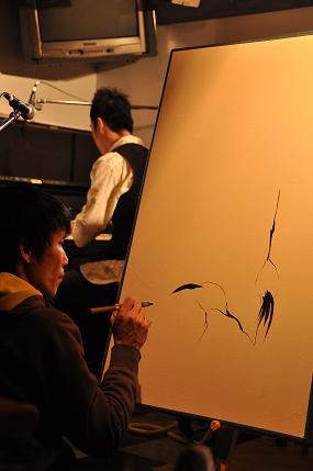 女子が撮影してくれた、先日の【羊の歌】での水墨画実演の模様です♪ 筆の走りの非常に最初の方ですが、どうぞ。 二匹の鶴がいて、 この後川辺、竹林が描きこまれました。 伴奏は北九州の安部君。 かなりいいコラボレーションになったと思います^^ 感謝! |